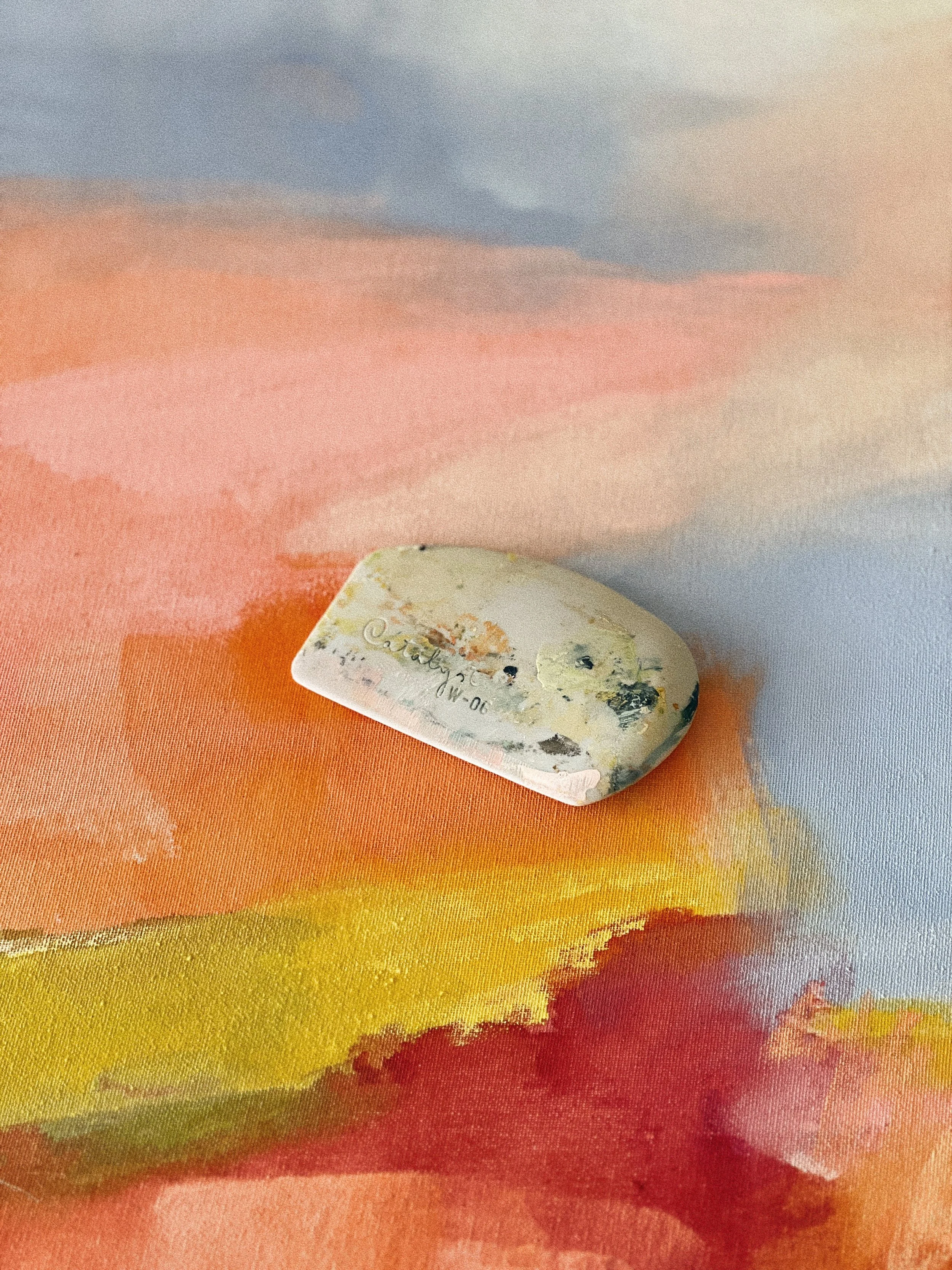A fun, happy piece blending warm oranges and pinks with sky blues, vibrant yellows, greens and a little splash of sweet burgundy.