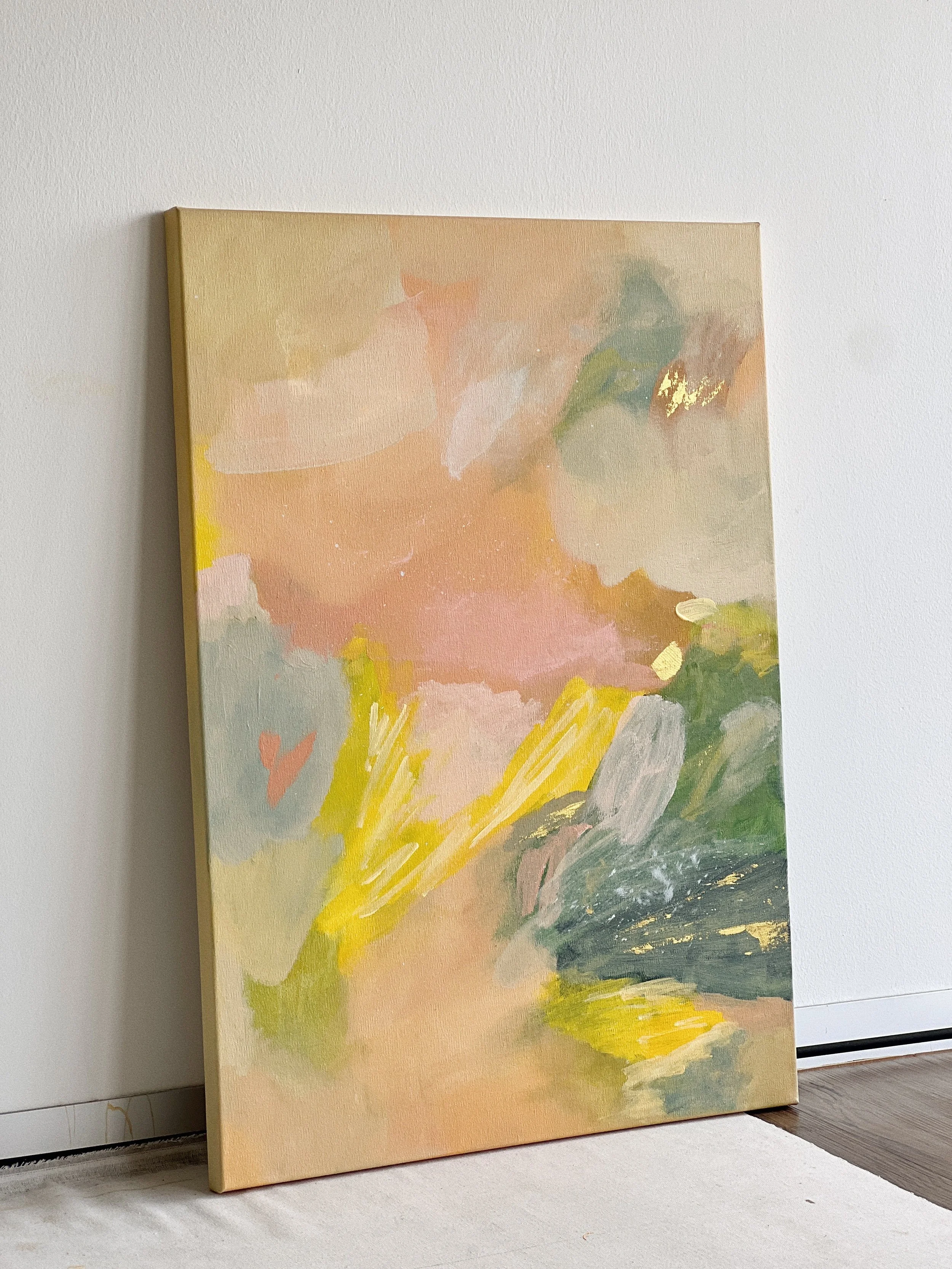 Fruit Smoothie is a refreshing blend of soft layers in pink, orange, yellow. Gentle and uplifting, this abstract painting can brighten any space.