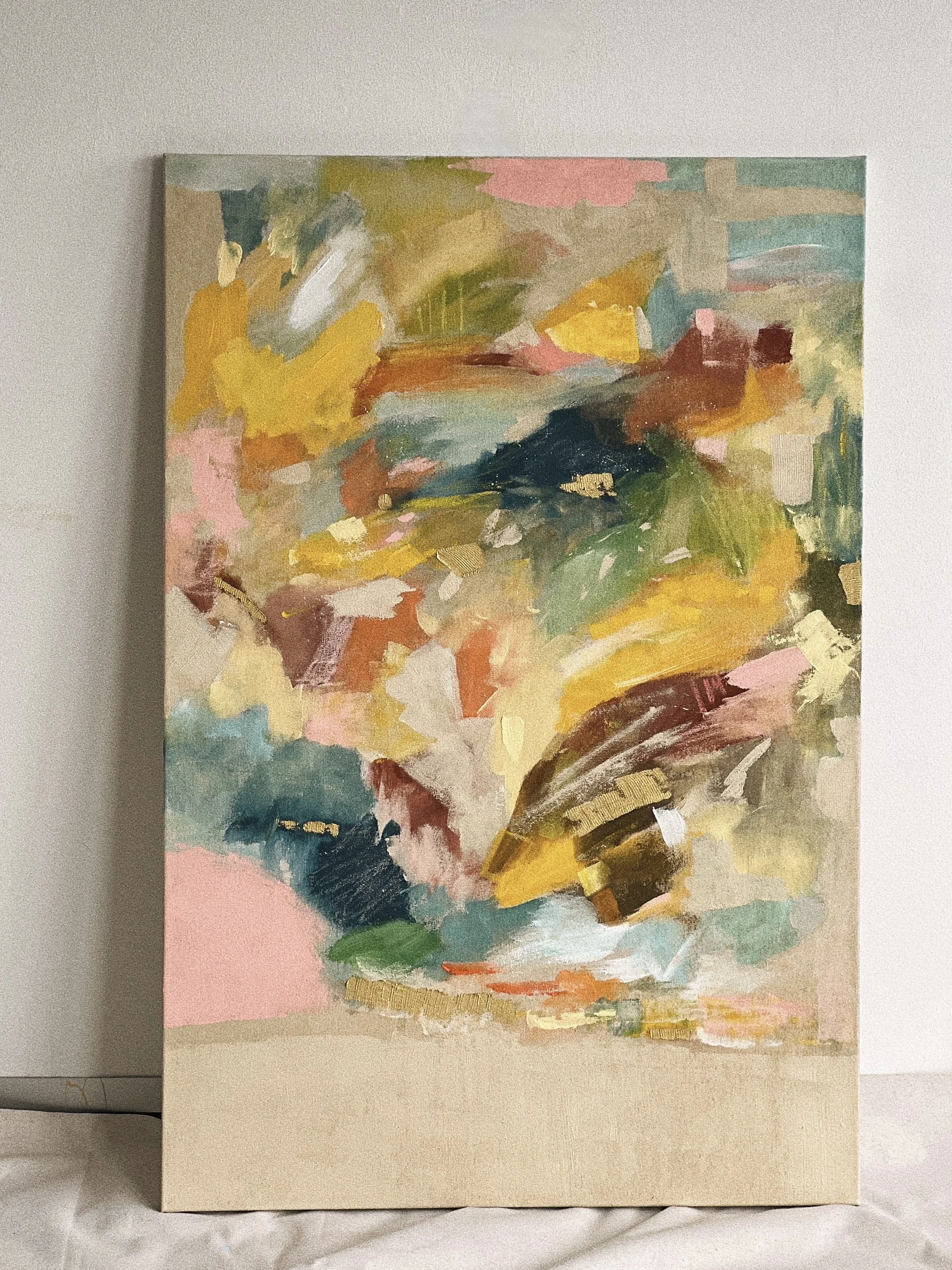 AVAILABLEA colorful, intuitive piece completely guided by the heart. “Heartfelt” plays with color and space on raw linen canvas. Bold, expressive gestures unfold across the surface, contrasted by moments of quiet stillness – a gentle reminder that intuition leads in many ways.