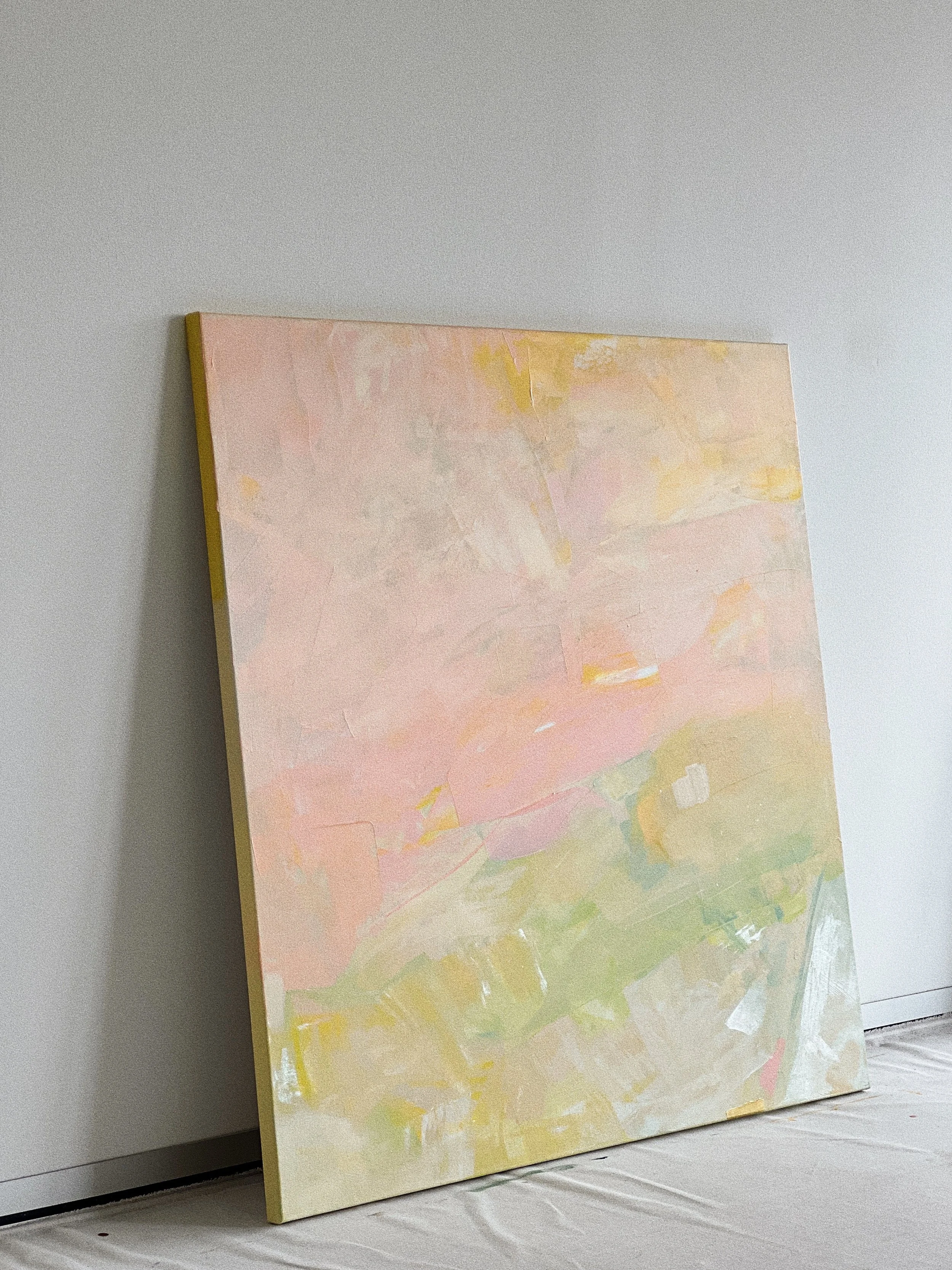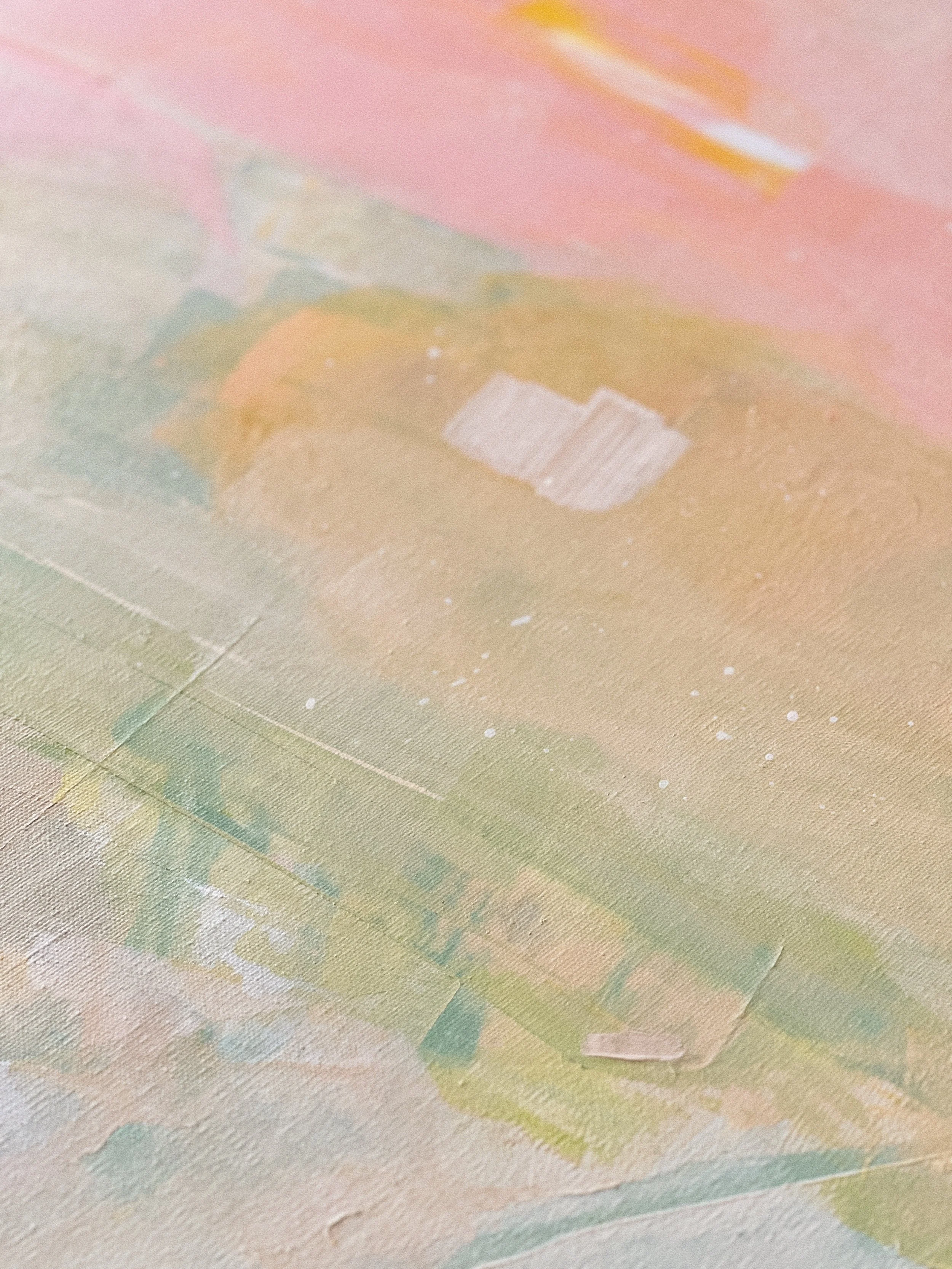 A delightful dance of soft pinks, yellows, creams, greens, teals and gold, this abstract painting blends gentle layers into a soothing, muted pastel palette. Uplifting yet calm, it’s a visual reminder to always choose joy in the little things. A quiet celebration of fresh mornings and the hope it brings.